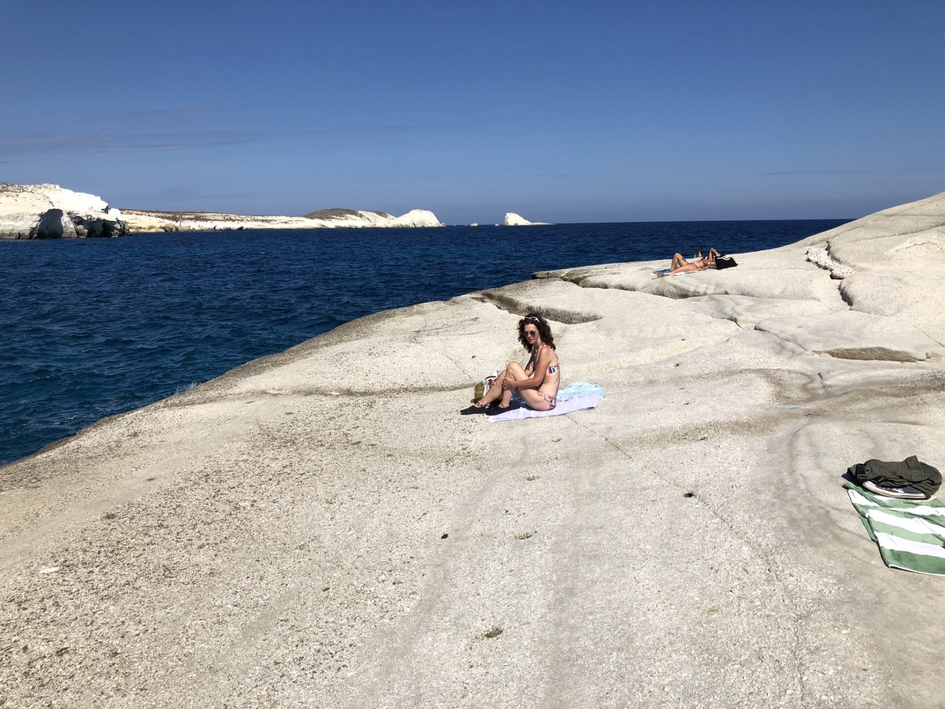 28 september eerste volle dag op Milos, we gaan op verkenning om te zien of het waar is van al die mooie plekjes op dit eiland, eerste stop Sarakiniko Beach, je waant je hier op de maan, grote krijtwitte rotspartijen, onnatuurlijk gewoon maar verschrikkelijk mooi om te zien en even te vertoeven.