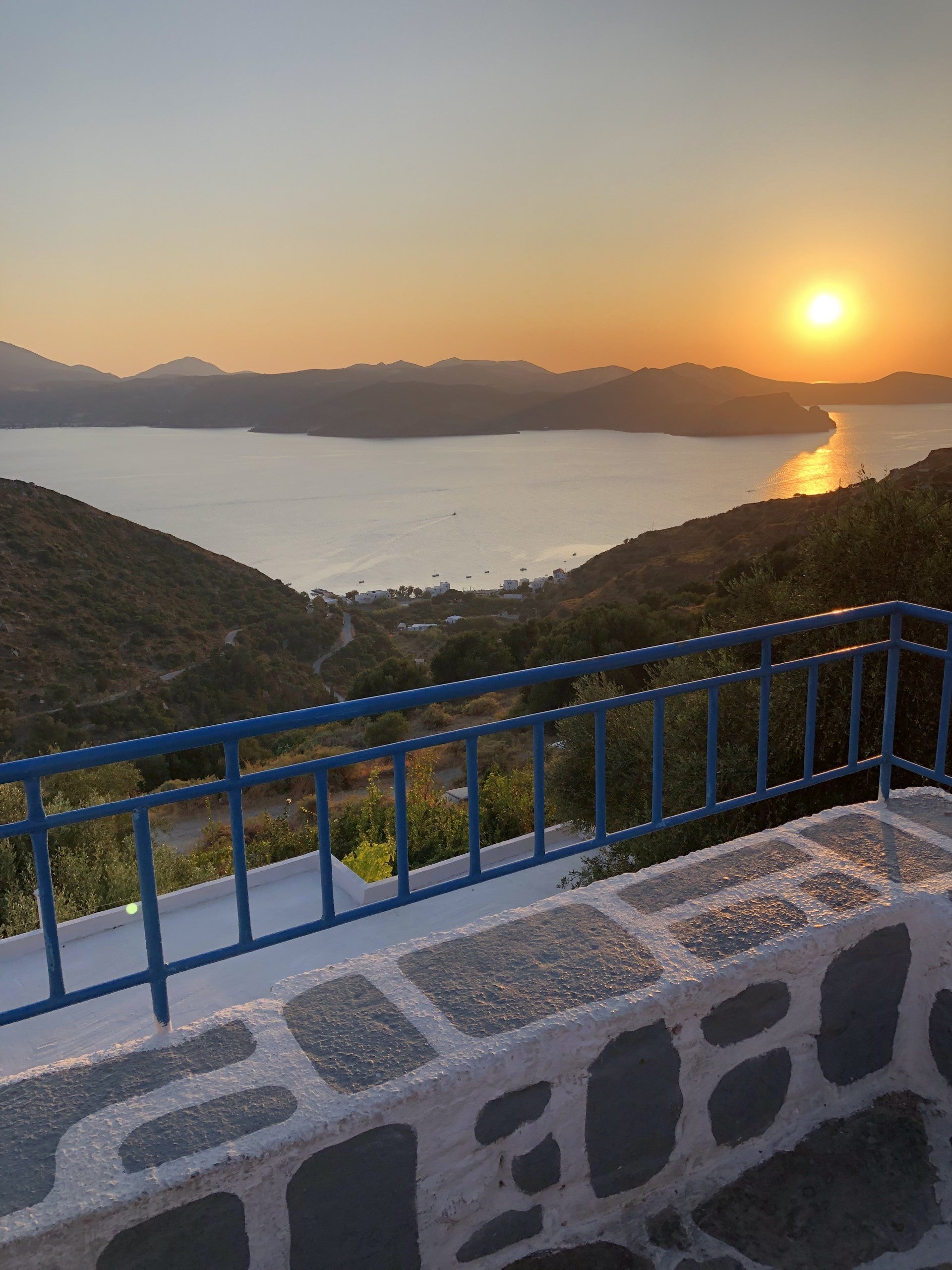 Appartement ligt in Plaka de hoofdstad van het eiland op een berg met mooi uitzicht, vanavond in een restaurant gegeten, dat was echt een culinair hoogstandje en op een locatie perfect, schitterende zonsondergang erbij wat wil je nog meer.